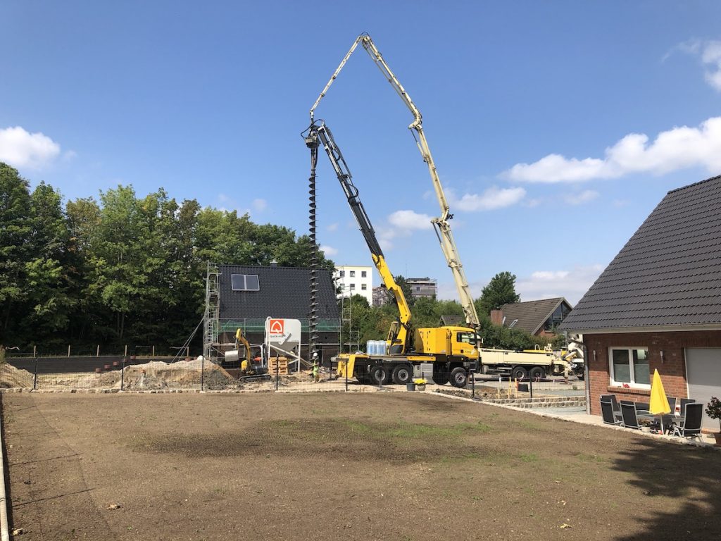 Die Bohrlöcher / -pfähle sind 12 Meter tief im Boden. Der Bohrer hat eine Hohe von 13 m. Auf dem Bild kann man schön sehen, dass der Bohrer über das Nachbarhaus hinaus ragt.