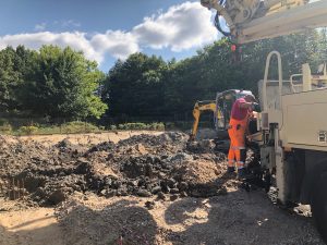 1. Es wird mit großer Maschine ein Loch in den Boden gebohrt.